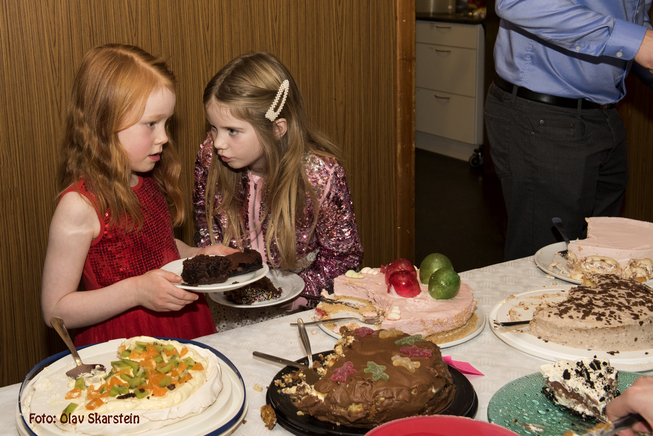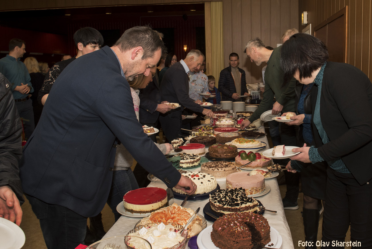 Bugnande kakebord for både store og små. Her var det bortkasta å telje kaloriar. Heller notere dei gode smakane. Køa til kakebordet var lang som ei æve. Men så var det då 300 med stort og smått som skulle fylle sine søtmunnar.