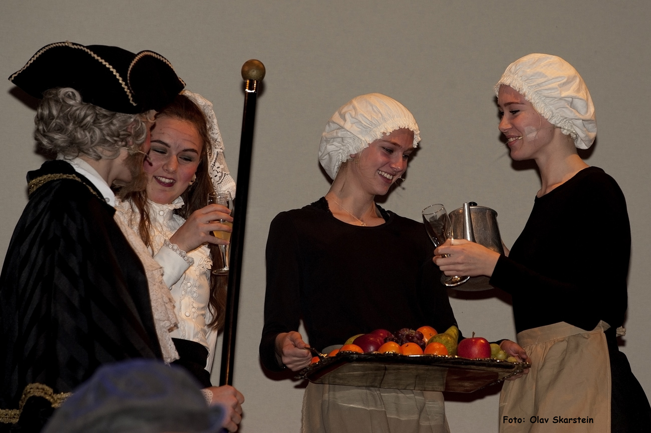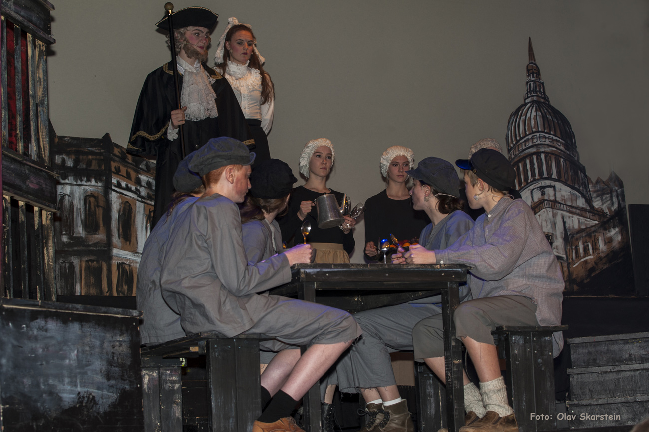 Måltid på fattighuset. Bak er Herr Buldre og Fru Skrulle, Leon Nogva Vedeld og Vilde Ravnestad. Tenarar Line Flem og Hannah Fjørtoft. Rundt bordet er Bjørn Longva jr., Andrea Milic og Adrian V. Molnes synlege.