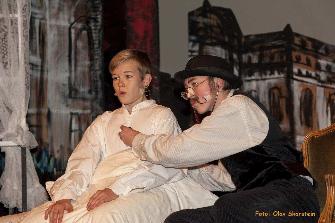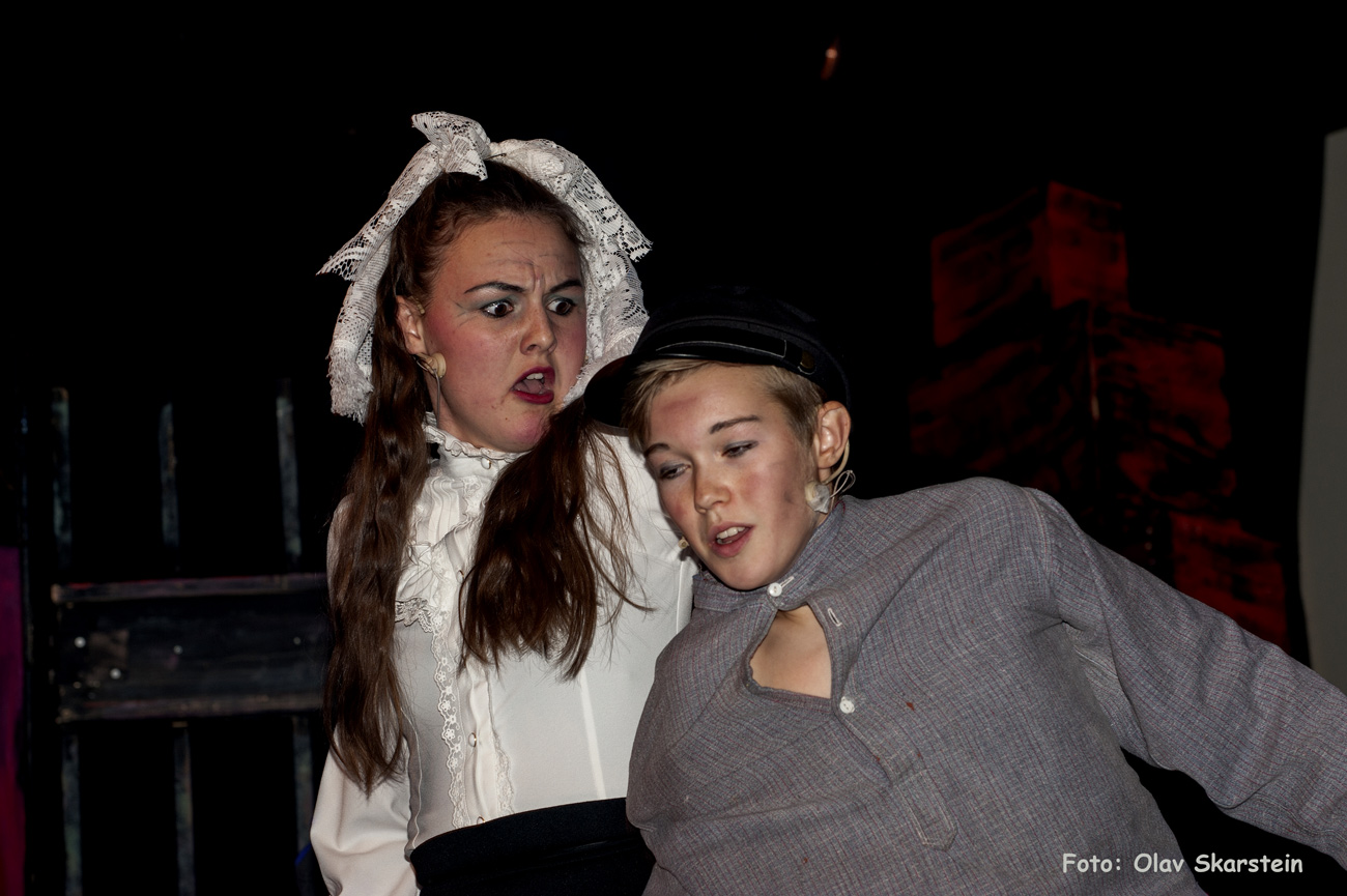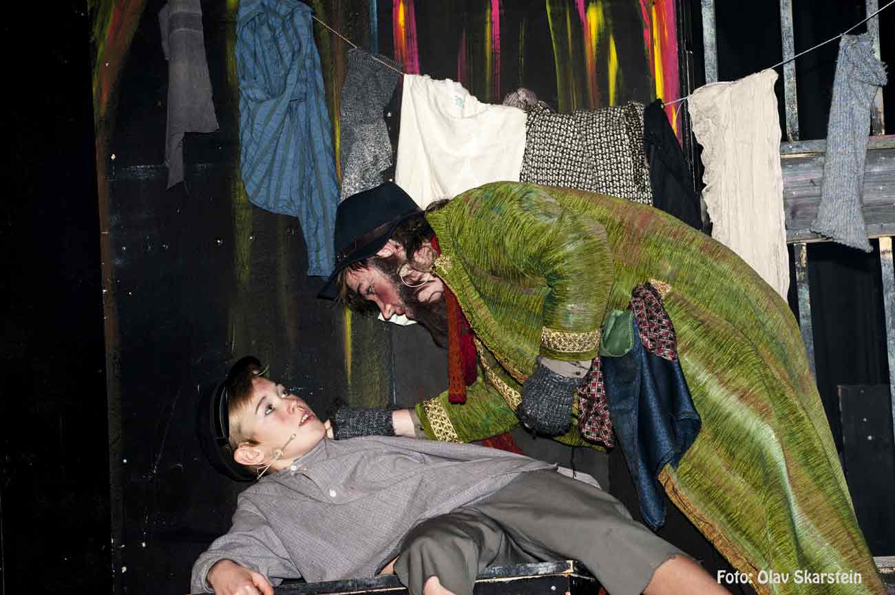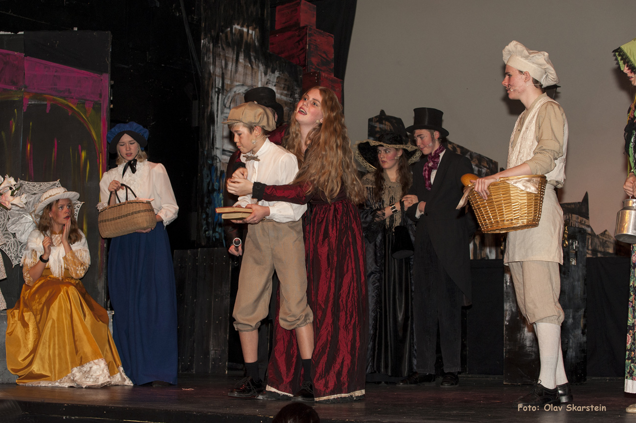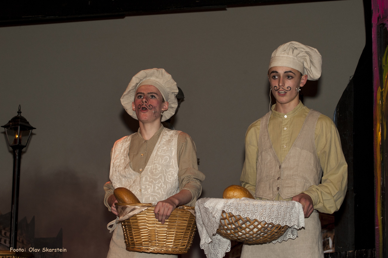 Merka meg at Håkon Flem i rolla som Fagin, opna litt forsiktig, for deretter å rule! Vilde Ravnestad som fru Skrulle, har stemma til å avbryte eit kvart ekteskap. Fru Surbær, Aurora Longva set alle på plass. Mannssjåvinist herr Buldre tolka av Leon Nogva Vedeld, var ikkje fornøgd med utviklinga i livet. Frida Otterlei med 3 roller, eller var det 4, der Gamle Sally kjem på topp. Elias Flem er dr Gråhår med stetoskop og diagnose. Godt spelt!