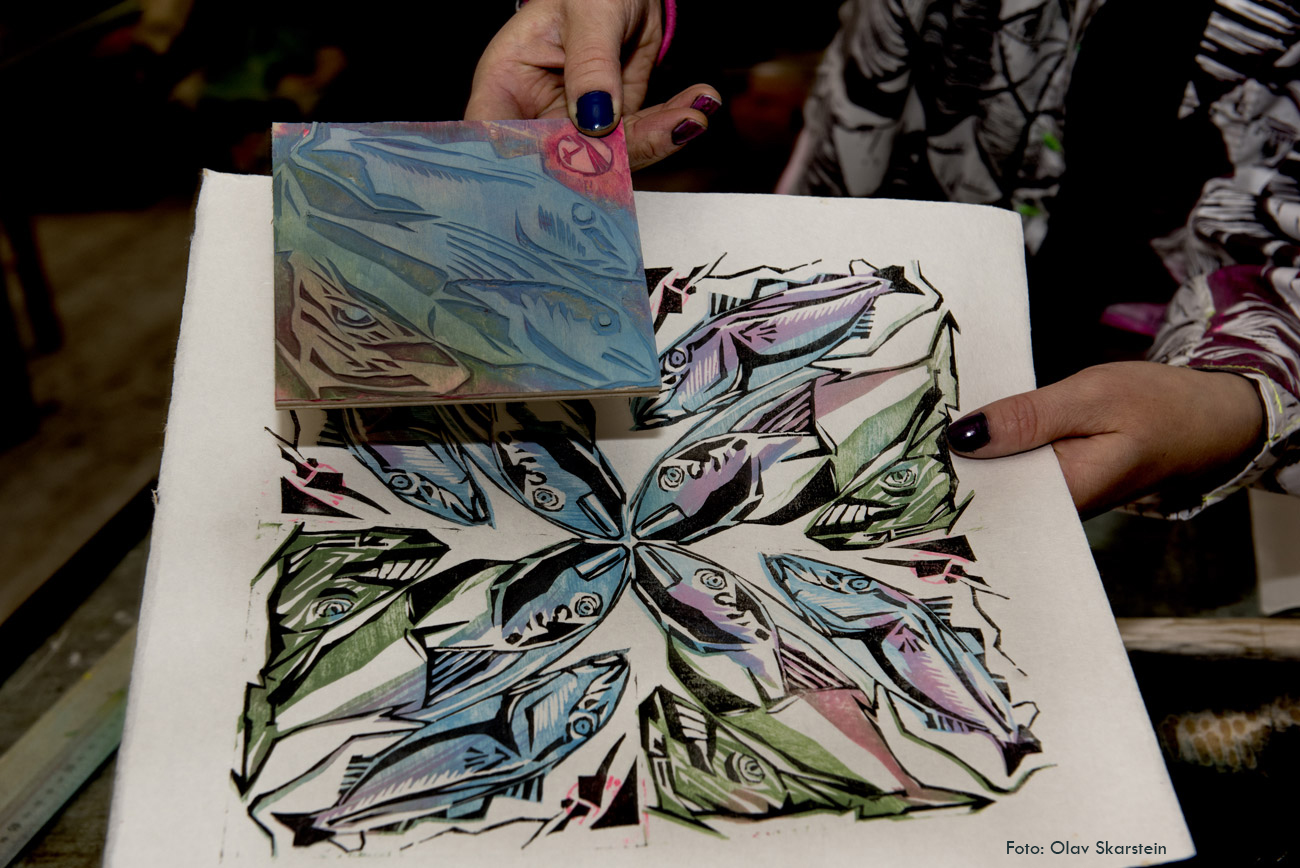 I Japan nyttar dei andre verktøy og teknikk i treskjering. M.a. skjer dei djupare og løftar vekk dei utskorne bitane. Karin nytta dei japanske teknikkane ho lærde i Japan under prosjektveka på Nogva. Her i landet er det vanleg å nytte mekaniske presser til trykking, medan trykking med handkraft er meir vanleg der. Karin har lang erfaring med treskjering frå tidlegare, men synest det er fint å bruke ny lærdom