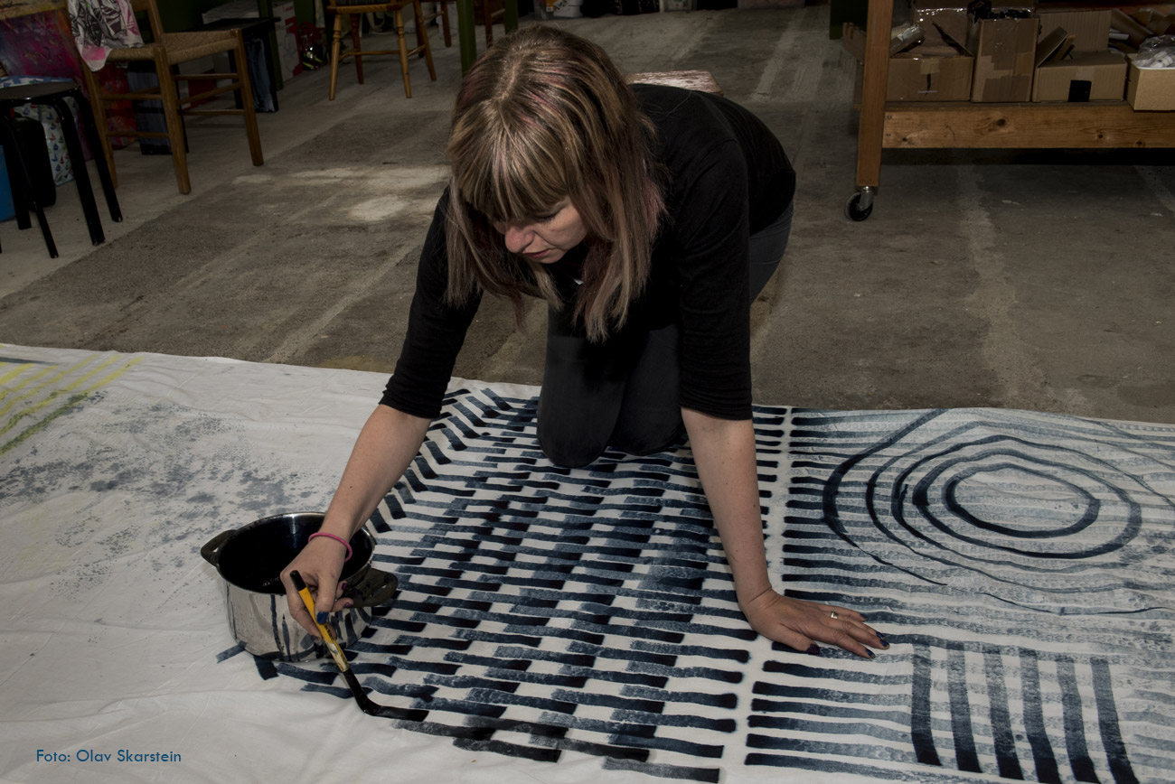 Karin hadde med seg Japan blå og hadde måla eit tøystykke. Her kom det fram ein annan forskjell. Eit målingsstrøk i Japan er eit strøk som startar fyldig, og vert svakare og svakare etter kvart som penselen vert tom. Ei gradering som skapar varriasjon.