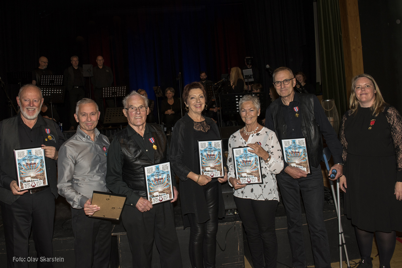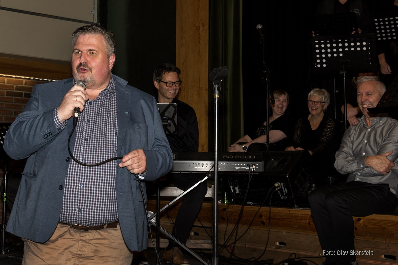 Bjørn Røren frå Sunnmøre Korforbund med humor og medaljar.Bjørn Røren hadde ei spesiell oppgåve med helsing frå korforbundet; humørfylt innleggg før medaljar og diplom vart overrekt til 8 kormedlemer. Stas. Og tenk kor fredelegt det var i huset når dei syngande koristane sette nasen mot øvingslokalet – utanfor heimen sin toneradar.